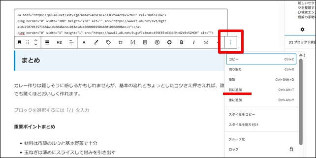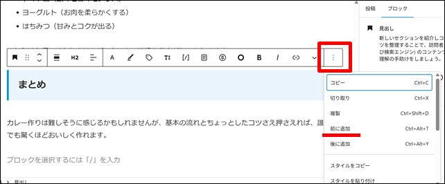 赤枠をクリックして「前に追加」をクリック。