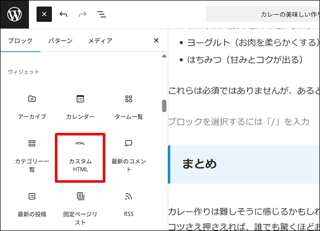 「カスタム HMTL」というブロックを探してクリックします。