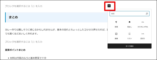 新しいブロックが追加されるので「+」をクリック。