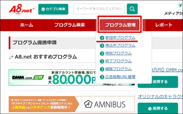 「プログラム管理」から「参加中プログラム」をクリックします。