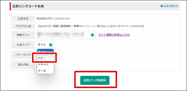 今回は「バナー」を選択します。「広告リンクを表示」をクリック。