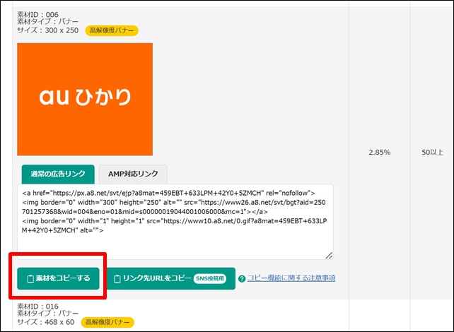 掲載したいバナーが決まったら「素材をコピーする」をクリック。