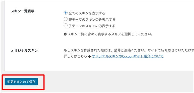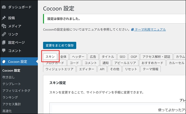 「スキン」というタブをクリック(Cocoonではデザインのことをスキンといいます)。