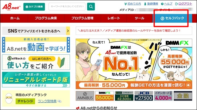 これがA8ネットの管理画面です。ここから色々な広告を探してブログに掲載することができます。