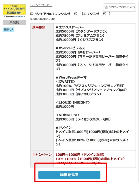 一番上にエックスサーバーが表示されるので「詳細を見る」をクリック。