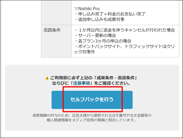 今回は自己アフィリエイトを行うので「セルフバック」をクリック。