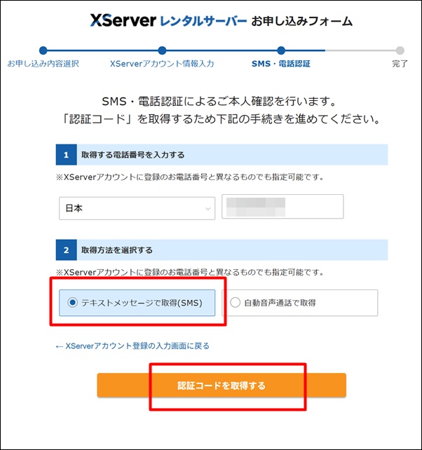「テキストメッセージで取得(SMS)」を選択(どちらでもOKです)。