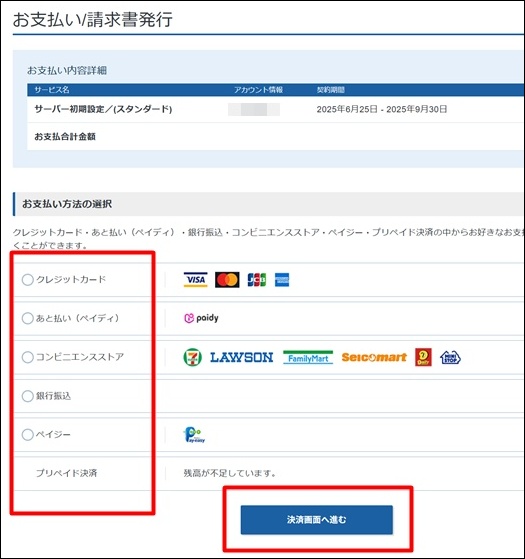 支払い方法を選択して「決済画面へ進む」をクリック。