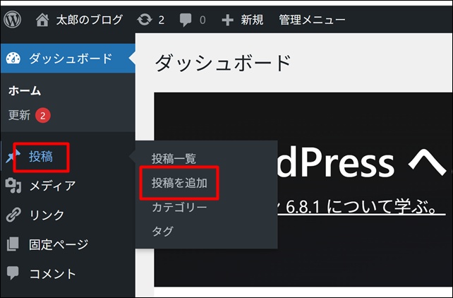 するとこのようにダッシュボードに戻るので「投稿」をクリック。
