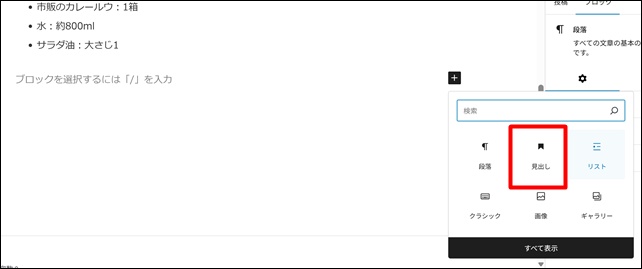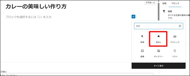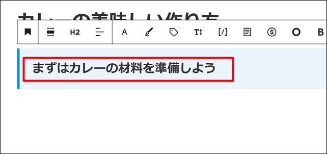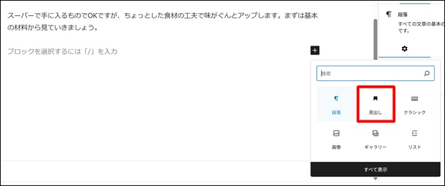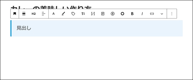 「見出し」のブロックを選択するとこのように見出しのブロックが挿入されます。