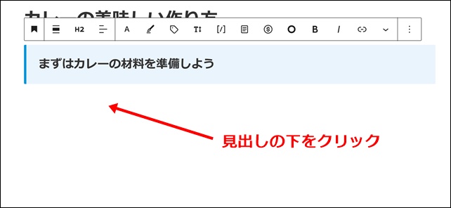 するとこのように大見出しの前に段落ブロックが追加されるので、ここに冒頭文を書いていきます。