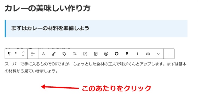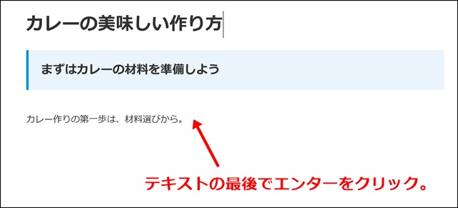 先ほどのように少し下をクリックして新しい段落を呼び出して記事を入れていきます。