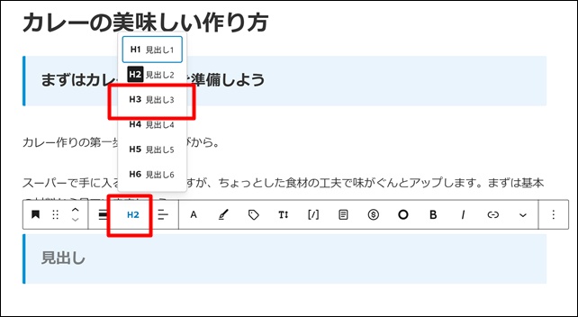 「H2」という箇所をクリックするとこのように「見出し1」~「見出し6」まで選択できます。