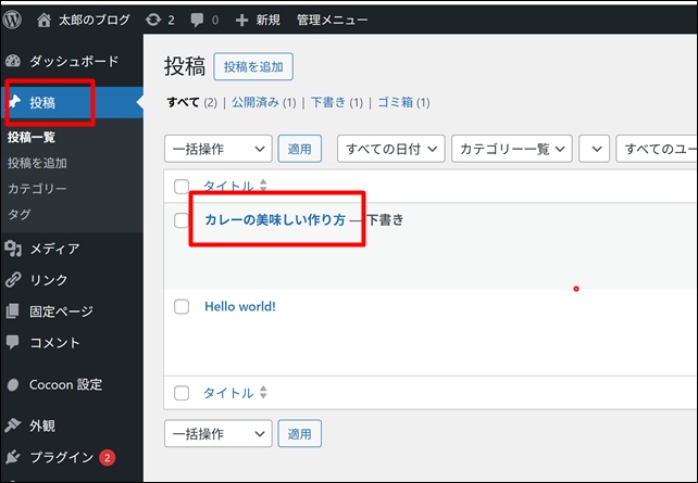 「投稿」をクリックしてステータス「公開済み」をクリック。