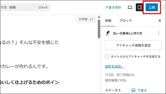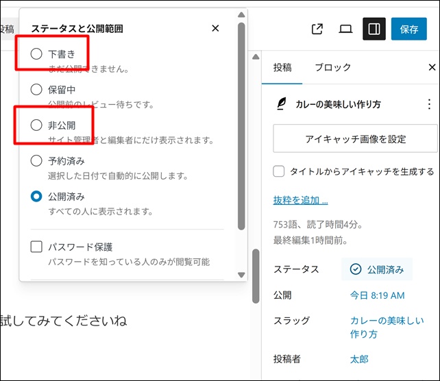 「下書き」もしくは「非公開」にチェックを入れましょう。