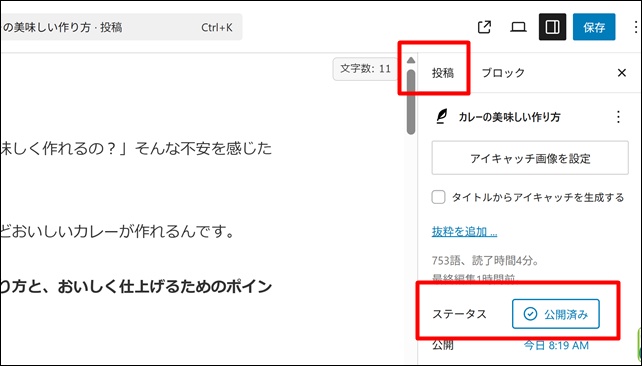 記事の作成を中断する場合は「保存」しておきましょう。保存しておけば続きから再開することができます。