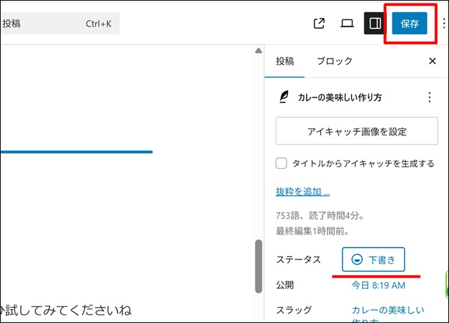ステータスが「下書き」に変わったことを確認したら「保存」をクリック。