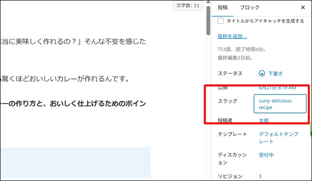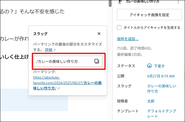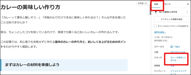 「スラッグ」という箇所に記事タイトルが書かれているのでクリック。