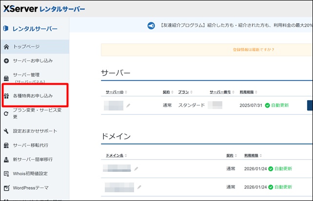 サイドメニューから「各種特典お申込み」をクリック。