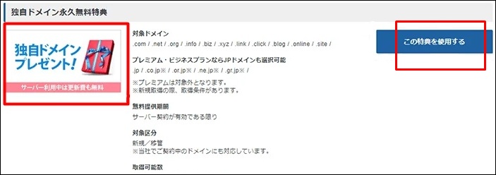 「独自ドメインプレゼント」という特典を探して「この特典を使用する」をクリック。