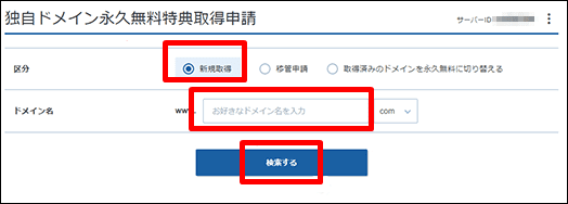 ドメインを決めたら「検索する」をクリック。