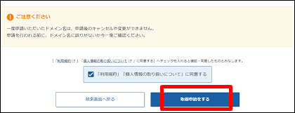 ドメインが決まったら「選択したドメインの取得申請をする」をクリック。